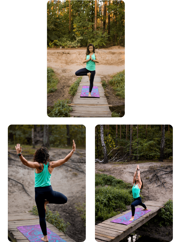 Na początku uczyłam się pozycji (asan) z książek, później – po urodzeniu córki – zaczęłam praktykować w domu, korzystając z lekcji online.
